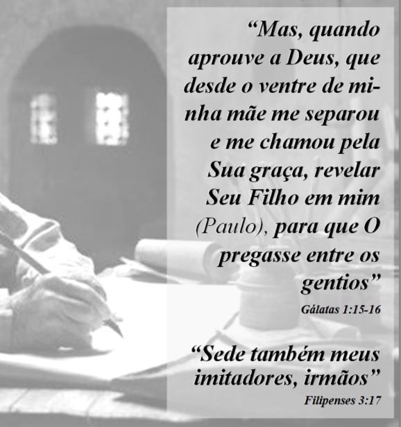 “Mas, quando aprouve a Deus, que desde o ventre de minha mãe me separou e me chamou pela Sua graça, revelar Seu Filho em mim (Paulo), para que O pregasse entre os gentios” (Gl 1:15, 16). “Sede também meus imitadores, irmãos” (Fp 3:17).