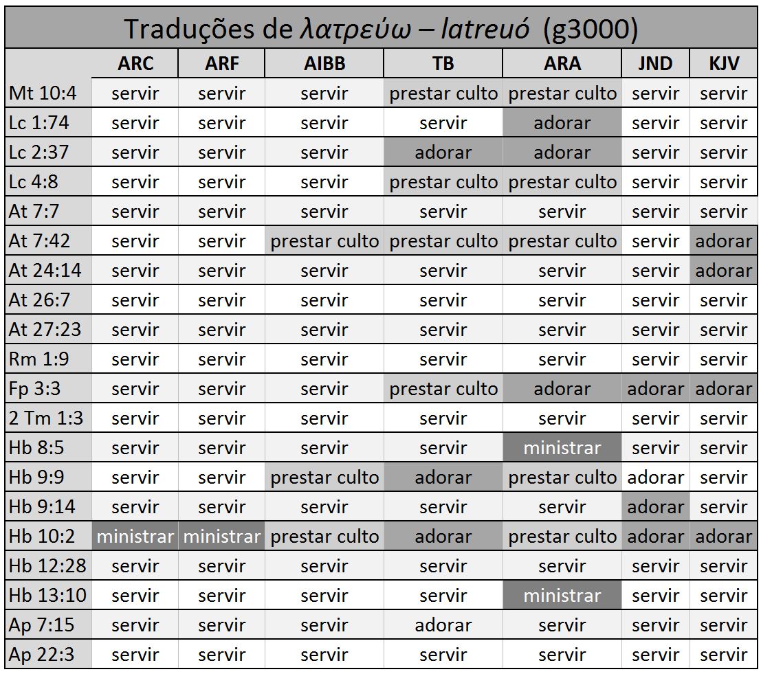Compare, quanto à força de latreuó, Lc 1:74; At 7:7, 24:14; Hb 9:14, 12:28; Ap 7:15, 22:3; para a adoração de ídolos, veja At 7:42; Rm 1:25. É aplicada também aos serviços relacionados com o primeiro concerto, Lc 2:37; At 26:7; Rm 9:4; e Hb 9:1, 6 (latreia), sendo omitida no original a palavra “divino” (v. 1) e “de Deus” (v. 9 – KJV) (como se não fosse mais reconhecido como tal). Veja também Hb 8:5, 10:2 (“ministrantes” ou “adoradores” – JND), 13:10. Outras passagens são Fp 3:3; At 27:23; Rm 1:9; 2 Tm 1:3; Rm 12:1 e, em total contraste, Jo 16:2 (latreia). Essas são quase todas as ocorrências.