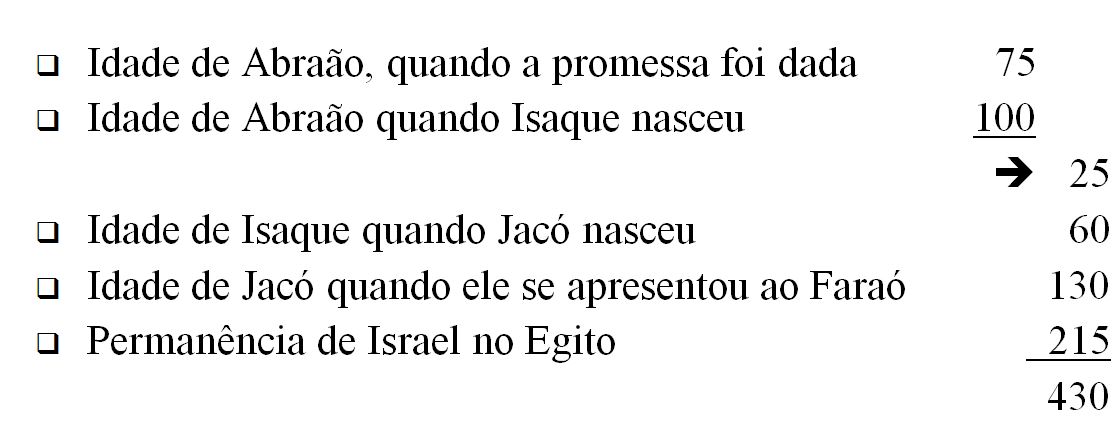 Se então este é o período correto, como ele concorda com Gênesis 15:13 e Êxodo 12:40? Em Gênesis 15:13 e Atos 7:6, nada é dito sobre o Egito: “peregrina será a tua semente em terra que não é sua” Isso foi dito a Abraão, e pode incluir todo o período desde o nascimento de Isaque até o Êxodo, que de acordo com o acima foi 405 anos – concordando assim com o número redondo de 400 anos. Êxodo 12:40 é redigido de forma diferente: “O tempo que os filhos de Israel habitaram no Egito foi de quatrocentos e trinta anos”. O Pentateuco Samaritano e a LXX adicionam as palavras “e de seus pais na terra de Canaã”; mas essas palavras não estão nas versões árabe, siríaca ou da Vulgata; e podem, portanto, ter sido adicionadas para atender à aparente dificuldade. É melhor considerar os 430 anos incluindo a permanência de Abraão (após a promessa), de Isaque e de Jacó, embora, estritamente falando, Abraão, Isaque e Jacó não fossem “filhos de Israel”.