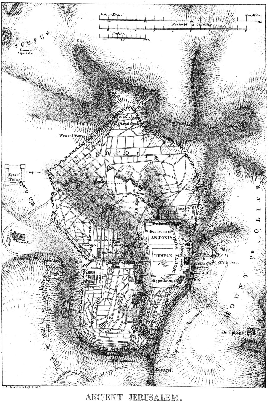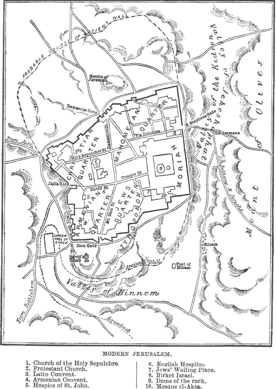 Muitas das casas, embora construídas de pedra, estão dilapidadas e as ruas estreitas e sujas; a porção dos judeus é declarada a pior. Mas desde que a ferrovia foi construída de Jafa a Jerusalém, melhorias estão sendo feitas na cidade, e muitas casas estão sendo erguidas fora dos muros. Os judeus não são permitidos na área do Templo, portanto, eles se reúnem em um local próximo ao arco de Robinson, denominado Lugar dos Judeus, onde podem se aproximar das paredes da área, que são construídas com pedras muito grandes e antigas. Nas sextas-feiras e dias de festa, eles se reúnem em grande número; eles beijam as pedras e choram, e oram pela restauração de sua cidade e templo, sendo, infelizmente, ainda cegos para a única forma verdadeira de bênção por meio do Senhor Jesus a Quem eles crucificaram.