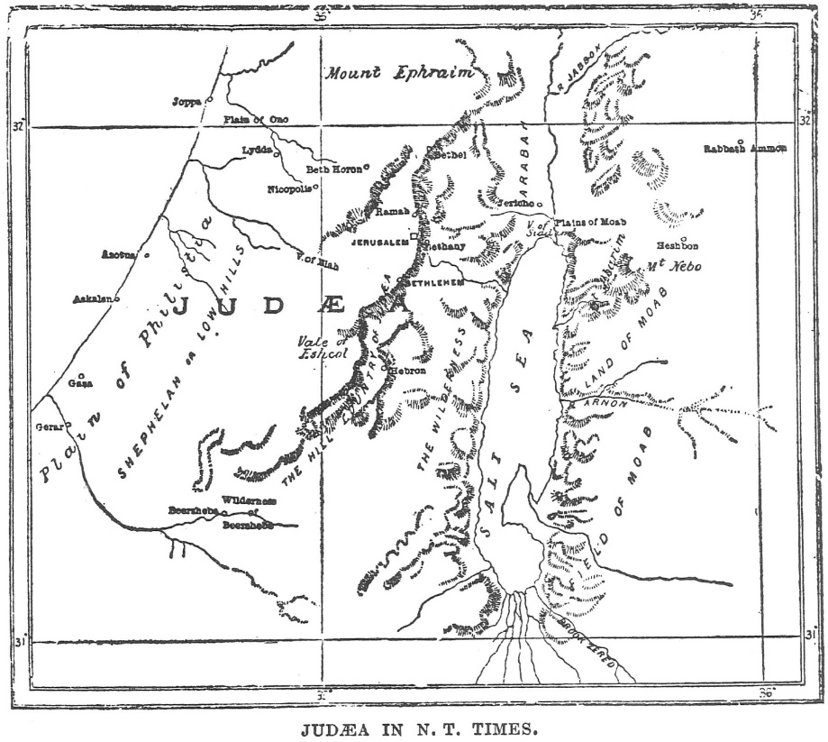 Em Esdras 5:8 diz: “província de Judá” para o território de Judá; em Daniel 5:13 o mesmo é chamado “Judá”. No Novo Testamento, o nome às vezes se refere a um distrito muito maior, incluindo todo o sul, cerca de 32°5’N com a planície na fronteira oeste da terra até o monte Carmelo, conforme geralmente mostrado nos mapas do Novo Testamento. A terra foi então dividida por Roma, com Samaria no centro e Galileia no norte. Em Lucas 3:1, a Judeia abrange o que precede e Samaria; mas em outras passagens uma área menor do que a acima está implícita. Atos 12:19 fala de Herodes descendo da Judeia para Cesareia, enquanto Cesareia seria parte da Judeia dos romanos. Paulo, em Gálatas 1:22 e 1 Tessalonicenses 2:14, fala das “igrejas da Judeia” que parecem abranger toda a Palestina.