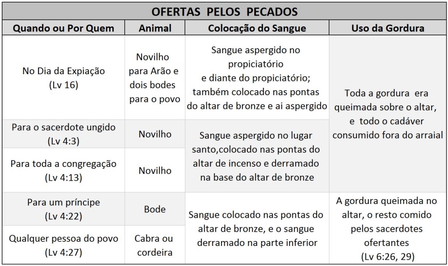 A oferta pelo pecado era para fazer expiação pelo pecado – para evitar o juízo sobre o ofertante. Esta característica geral é sempre a mesma, embora os detalhes sejam diferentes, como será visto na tabela a seguir: