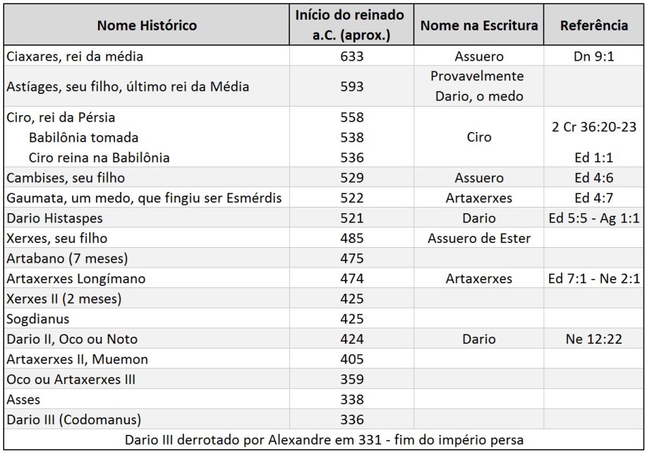 As datas acima são aquelas geralmente dadas aos reis da Pérsia, exceto nos. 8 e 9, as datas comuns das quais Usher e Hengstenberg provaram ser incorretas. Veja: Setenta Semanas. O reino da Babilônia era menor em extensão do que o da Pérsia. Este último incluía o que hoje é conhecido como Turquia na Ásia, Pérsia, Afeganistão e Baluchistão, até o rio Indo, com boa parte do Egito. De acordo com a linguagem da Escritura, ele “devorou muita carne”. Ester 1:1 fala de 127 províncias. Veja: Daniel e Ester.