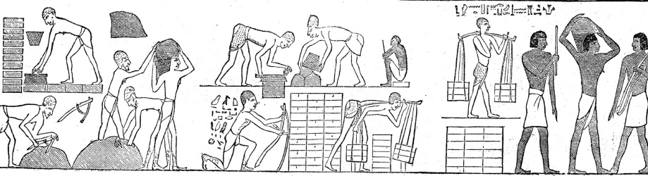 Já em Gênesis 11:3, lemos sobre tijolos sendo feitos e queimados; e no Egito os tijolos eram feitos com uma mistura de palha. Quando os israelitas tiveram que encontrar sua própria palha ou restolho e ainda fazer tantos tijolos por dia, é provável que apenas pouca palha foi usada. Alguns tijolos antigos foram encontrados que aparentemente não tinham palha neles. Muitos dos tijolos eram carimbados com o nome do monarca reinante. Nos monumentos em uma tumba, o processo de fabricação de tijolos no Egito é totalmente delineado: um mestre-tarefa se posiciona sobre os homens com uma vara na mão, como sem dúvida era o caso na época de Moisés (Êx 5:7- 19).