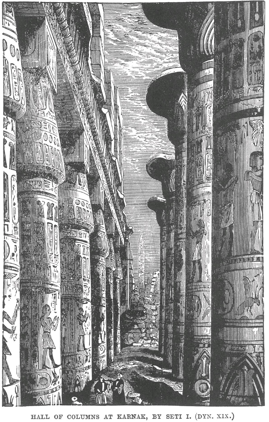 É provado pelos monumentos que os antigos egípcios foram um povo altamente civilizado e educado desde o início: eles não surgiram de uma escala inferior, como se pretende ensinar ao homem em geral nos dias modernos; mas, tanto quanto pode ser descoberto, suas primeiras grandes obras estão entre as suas melhores. Se o homem tem sido considerado brutal e degradado, é porque ele caiu da condição inteligente em que Adão e Eva foram criados. Antes do dilúvio, lemos que o uso de bronze, ou cobre, e ferro foi descoberto, e há provas de que muitas outras artes eram conhecidas no Egito. As ciências também foram cultivadas, incluindo a astronomia. A ilustração do Salão de Karnak dá uma ideia do tamanho de seus templos.