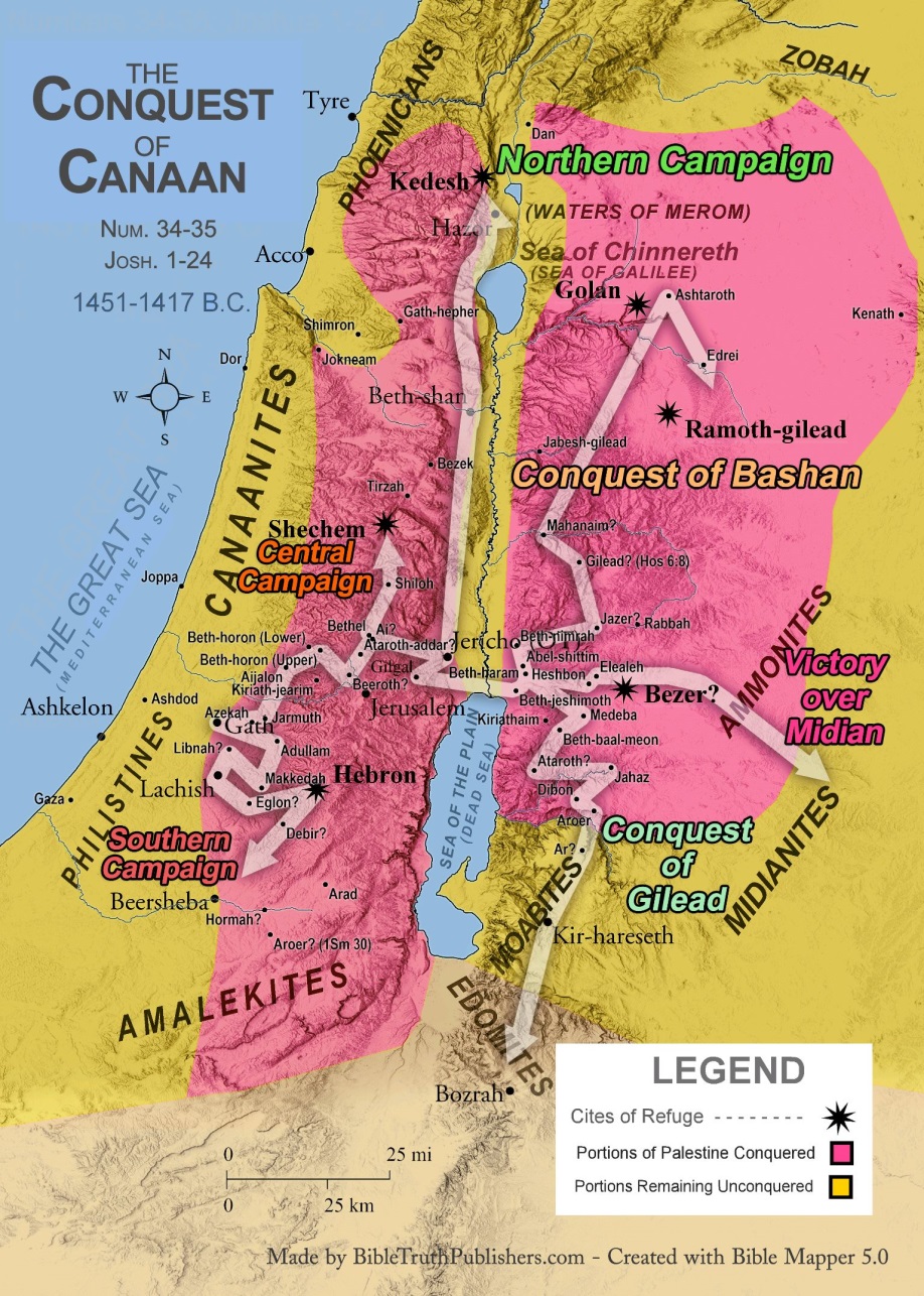 Josué 11-12. De Gilgal, Josué partiu novamente com força contra a confederação do norte, sendo encorajado pelo Senhor, e conquistou em todos os lugares, expulsando os anaquins das montanhas, e “Assim, Josué tomou toda esta terra conforme tudo o que o Senhor tinha dito a Moisés”. Os gibeonitas e seus aliados de três outras cidades (Js 9:17) foram os únicos que fizeram aliança com Israel. Os nomes então são dados dos 2 reis conquistados por Moisés no leste do Jordão e 31 reis no oeste feridos por Josué.