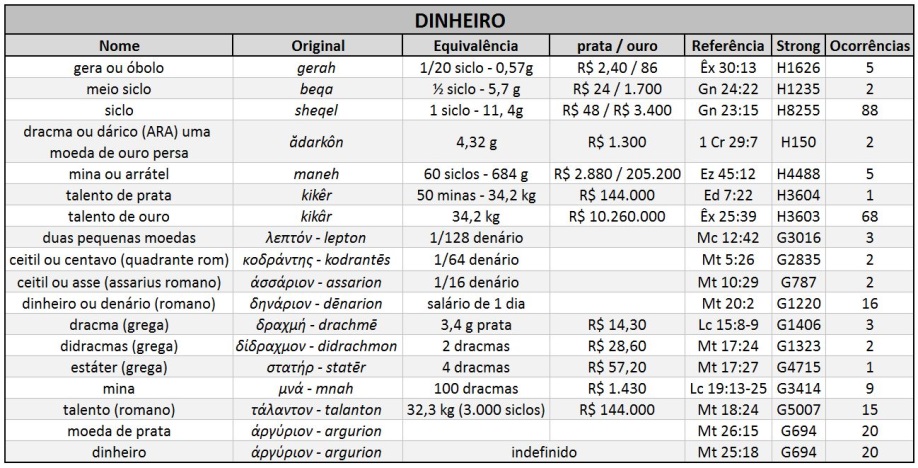 No Velho Testamento, o dinheiro era pesado. A primeira transação registrada na Escritura é a de Abraão comprando o campo de Efrom, o heteu, por 400 siclos de prata, que Abraão “pesou” para Efrom (Gn 23:15-16). O siclo aqui era um peso. Judas Macabeu, por volta de 141 a.C., foi o primeiro a cunhar dinheiro judaico, embora sem dúvida existisse de velhas moedas de prata de valor conhecido, que passavam de mão em mão sem serem sempre pesadas. Herodes, o grande, cunhou dinheiro com seu nome; e Herodes Agripa tinha algumas moedas; mas depois disso as moedas na Palestina eram romanas.
