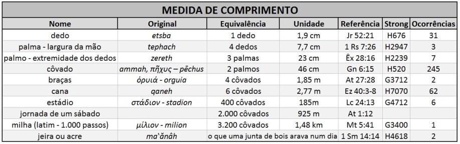 As medidas acima são calculadas a partir do “côvado” sendo o mesmo que o hebraico ammah e o grego πῆχυς – pēchus, o qual é encontrado em Mateus 6:27; Lucas 12:25: João 21:8; Apocalipse 21:17. Esse pode ser chamado de côvado curto (talvez não o mais curto: Veja: Côvado). Em Ezequiel 41:8 está a expressão “a medida de uma cana inteira: seis côvados grandes”. Supõe-se que o “côvado grande” tenha um côvado e uma largura de mão. Isso faria com que a cana de Ezequiel tivesse cerca de 3,236 metros. Adicionando um sexto a qualquer uma das medidas acima, eles corresponderão ao grande côvado. Não pode haver dúvida, no entanto, que o “estádio” e a “milha” eram medidas gregas.