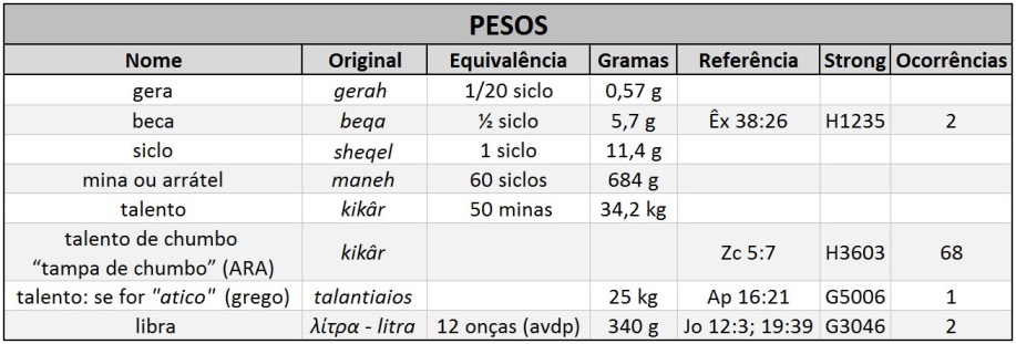 Deve-se notar que há dois siclos mencionados no Velho Testamento: um de acordo com o “peso do rei”, provavelmente o siclo padrão usado para todos os negócios comuns[159] (Êx 38:29; Js 7:21; 2 Sm 14:26; Am 8:5); e outro chamado “siclo do santuário”, do qual é dito em Êxodo 30:13; Levítico 27:25; Números 3:47 e 18:16, “este siclo é de 20 geras”, sugerindo talvez que o siclo comum era diferente. Michaelis diz que a proporção era de 5 para 3, sendo o siclo de negócios o menor.