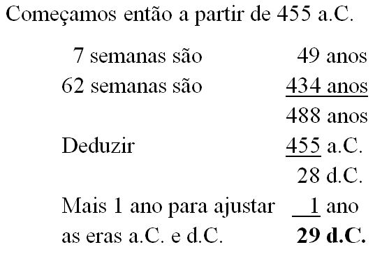 Este período foi tirado de uma importante profecia de Daniel 9:25-27. As setenta semanas são divididas em três partes, a saber, 7, 62 e 1. Veremos a seguir que “semanas de anos” são o que evidentemente se pretende dizer. O primeiro período de 7 semanas refere-se à construção das ruas e do muro, ou fosso, em tempos difíceis, dos quais se encontra um relato no livro de Neemias. O segundo período de 62 semanas se estende até aos tempos do Messias, o Príncipe, após o qual Ele deve ser cortado e não ter nada (TB) – nada de Sua glória messiânica. Para conciliar com isso as datas da história, deve-se notar que essas semanas não datam do mandamento de construir o templo (que foi no primeiro ano de Ciro rei da Pérsia, Esdras 1:1), mas do mandamento para restaurar e construir a cidade de Jerusalém, que foi dado no vigésimo ano de Artaxerxes (Ne 2:1).